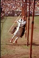 Die es geschafft haben, sammeln sich am Turniertag morgens um sieben auf der Trostburg, dem Geburtsort Oswalds, der im 15. Jahrhundert von hier aus als Minnesänger, Politiker und Abenteurer durch die Lande zog. Für die Reiter auf seinen Spuren ist die Trostburg der Ausgangspunkt zu ihren Abenteuern. Das erste ist das Ringstechen im engen Rund des Kofls hoch über Kastelruth. Im Galopp gilt es eine Lanze durch Ringe zu werfen. In Seis erfordert ein Labyrinth besonderes Geschick von Ross und Reiter, ehe sie am Völser Weiher ein Hindernisgalopp auf die Probe stellt.